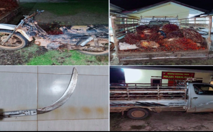Untuk barang bukti yang telah berhasil diamankan yaitu : 1 unit mobil Daihatsu Grand Max BE 8916 KV, 1 unit sepeda motor tanpa nomor polisi, 1 buah egrek (alat panen) dan sebanyak 1 ton tandan buah sawit.