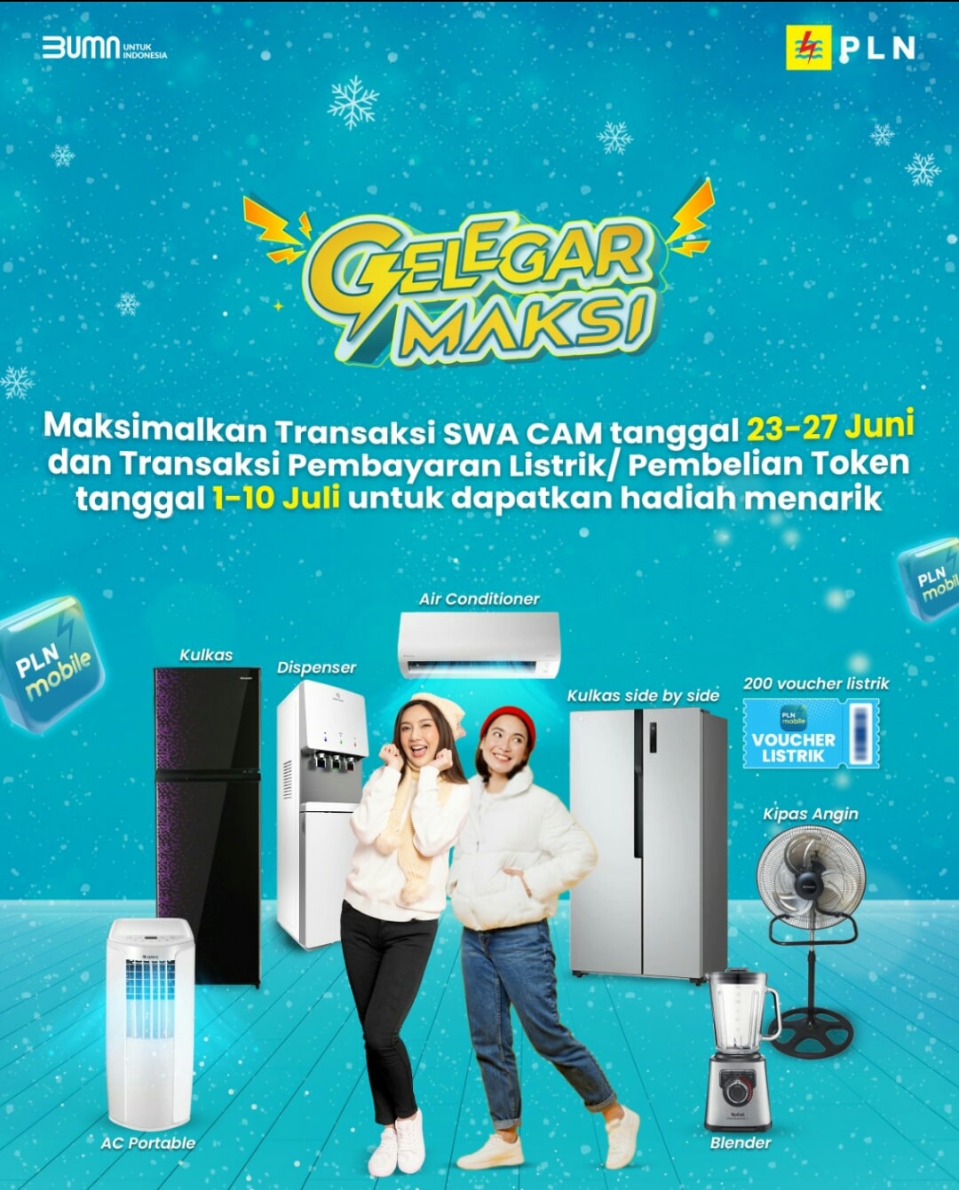 PALEMBANG (AbdiJurnalis, Sumsel) – PT. PLN Persero tengah mengadakan Program Gelegar Maksi di bulan Juli berhadiah peralatan elektronik, diantaranya 1 unit Kulkas Side by Side, 2 unit Air Conditioner, 2 unit Dispenser, 2 unit Kulkas, dan 2 unit AC Portable. Hadiah tersebut bisa diraih oleh pelanggan PLN yang telah melakukan pembayaran listrik di awal bulan, antara tanggal 01 hingga 10 Juli 2024, dengan cara melakukan penukaran kupon hadiah melalui PLN Mobile.